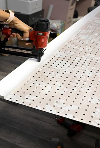 Apply wood glue in between the pegboard holes where one of the pine boards will go, place the board on top, and clamp along the board to hold everything in place. Once the glue dries a little, use the Arrow PT18G pneumatic brad nailer to secure the wooden frame to the pegboard every 12″ or so. Repeat on all sides.