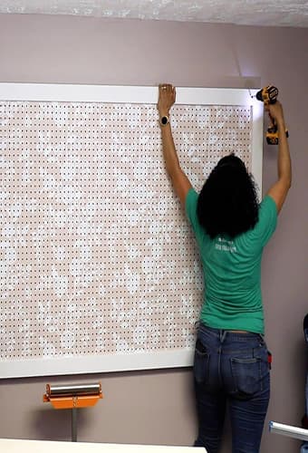 Once you’ve found the studs, use a power drill and 2 ½” screws (with a level to make sure the boards are parallel) to secure the boards (top and bottom, evenly spaced 4′ apart) to the wall. You may want to hang a few vertical boards as well to help support the pegboard. Keep in mind that the vertical braces will reduce the number of holes available to hang things but will give your pegboard more stability in the middle.