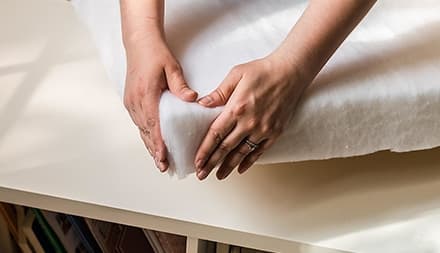 Lay the batting over the foam, then lift the batting up on one side and spray the side edge of the foam (the 3″ tall part) with spray adhesive. Gently press the batting against the side of the foam. Repeat for all four sides. For the corners, press the sides and smooth all the way to the corner, leaving the extra batting puckering out at the point.