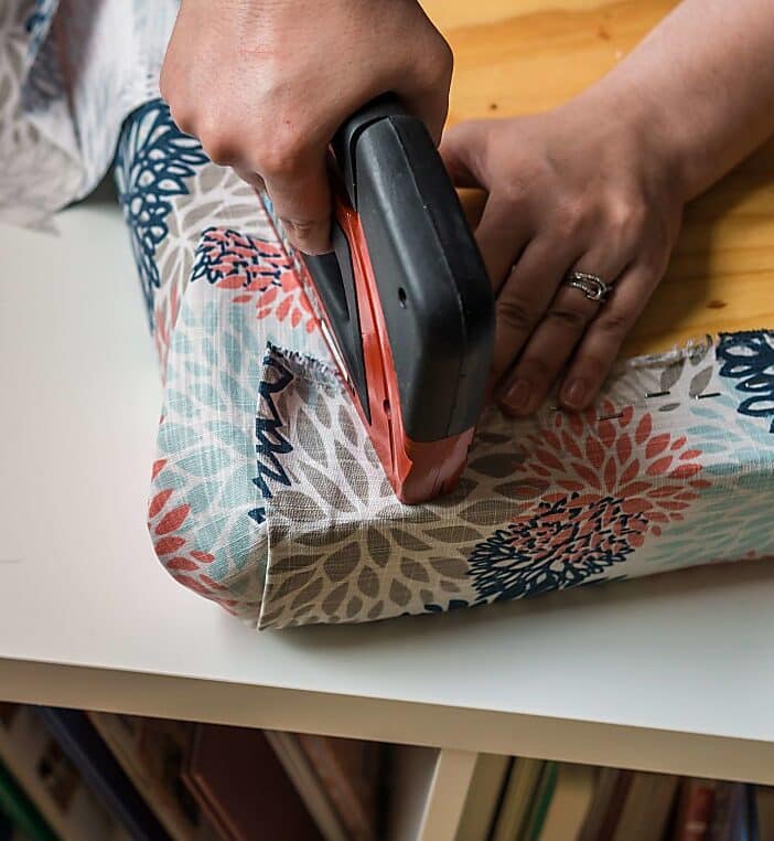 Repeat for the remaining three corners. Then examine the top and bottom of your cushion to ensure that there aren’t any gaps in your fabric. If there are, add more staples.