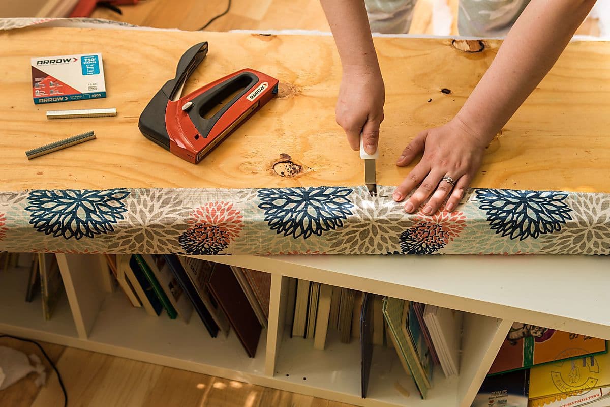Now it’s time to upholster your cushion! Start by laying out your fabric on top of the cushion; line it up so that any patterns are straight and square to the cushion. Trim away the extra fabric, leaving 3″–5″ of fabric overhanging the bottom of the plywood on all four sides.