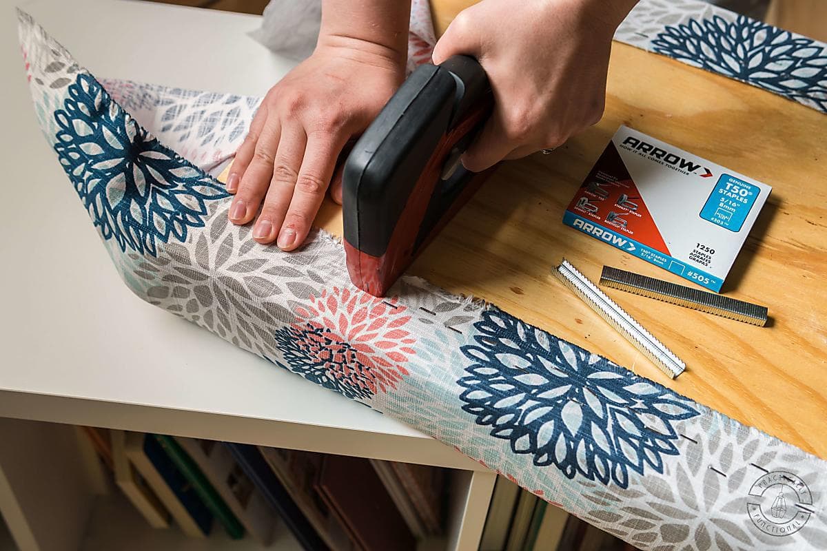 Starting in the middle of one straight edge, gently pull the fabric up and around to the back of the cushion and staple it to the plywood using your T50R.E.D. staple gun. Your staples should be 1″–2″ from the edge of the plywood – don’t worry if that leaves a bunch of loose fabric behind the staple, you can trim that off after you’re done stapling. Be sure to pull the fabric straight back (perpendicular to the edge of the plywood) so that you don’t end up with weird pulls or pleats in your fabric as you go.