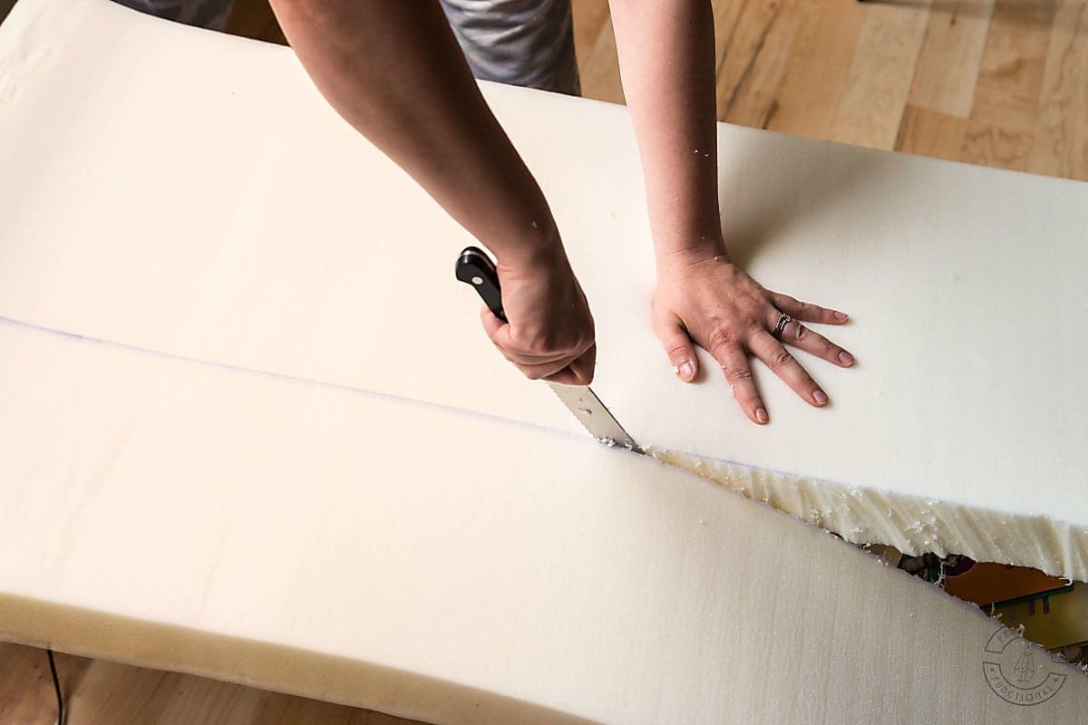 Lay your plywood on top of the bench foam, lining up two sides at a corner. Mark the edges of the other two sides on the foam using a pen or marker. Then cut the foam down to size using your serrated knife (a bread knife works just as well). Don’t worry if the edges of the foam aren’t perfectly smooth – the batting will cover that up later.