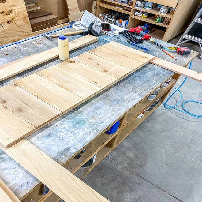 Cut the legs, short rails, and planks to length from the cedar fence pickets. Rip the rails down to 3 ½”, just like you did for the front and back panels. However, this time, you’ll rip the legs down to 2 ⅞”. Construct the side panels in the same way you did the front and back panels – by laying the legs and rails in position, then attaching the planks with wood glue and 1″ brad nails. There will also be a ⅝” inset on both ends.