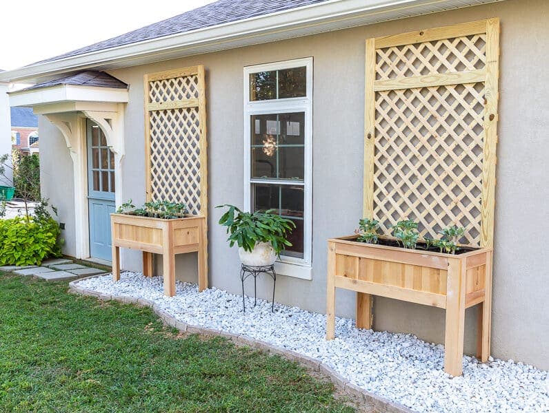 To assemble the trellis, lay the lattice down on top of the constructed frame and secure it with 1″ brad nails. If you don’t want to see the excess lattice under the planters, you have the option of using a cordless circular saw or jig saw to cut the excess from the bottom.