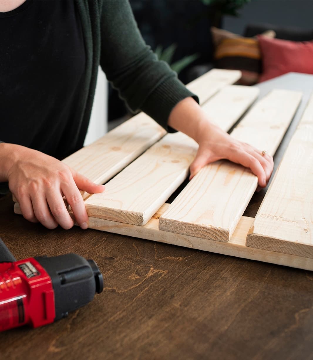 Flip the boards over again, so the A and B pieces are facing down, and the C piece is facing up. Take your second C piece and align it to the bottom of the B pieces. Use your PT18G brad nailer to attach the C piece to the A and B pieces, placing two nails in every board.