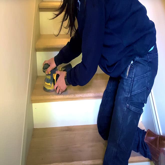 Foot traffic can wear down your stairway, but that’s nothing a little sanding can’t fix! Start by sanding each stair tread with your 120-grit sandpaper to expose the raw wood. This also opens up the wood fibers so that the wood oil finish can easily penetrate the surface. After about 30 minutes of sanding all the treads, the wood should look clean and new again!