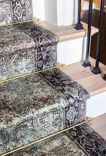Now that the necessary prep work is done, let’s move on to the fun part – installing the rug! First, figure out where to position the runner so that it’s centered on the stairs. One way to do this is to scoot the runner all the way over to one side of the stair tread, then measure the other side where the tread isn’t covered by the rug. Take this measurement and split the difference. Use painter’s tape to mark those measurements so the runner will stay straight and centered on the stairs.