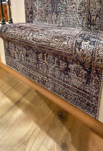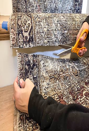 If your staircase is extra-long, you may need to use multiple runners. To join separate runners, use scissors to cut the first rug just under the stair nose and then cut off the top seam of the second rug and staple it right where the first rug ends. If you need to join a third runner, start from the bottom and work your way up to the second rug. This way, your border or seam can end at the bottom of the staircase. Just be sure to double- and triple-check your measurements because you want each rug to line up exactly with the previous one.