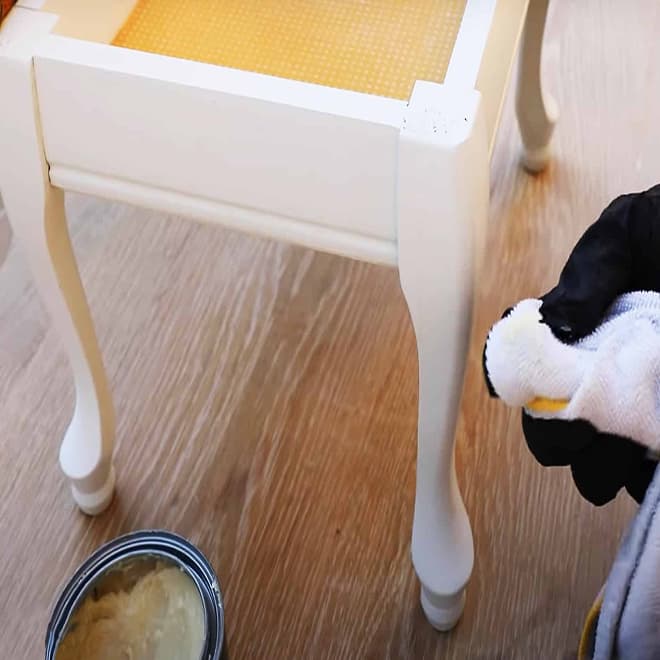 Now we can move on to the finishing touches. Applying a topcoat or furniture wax (which is what we used) is a good way to protect your paint. Start by applying some clear wax to a lint-free cloth – but don’t overload it! Then apply the wax to the painted wood and let it dry for three minutes. Last, use a clean, lint-free cloth to buff it to a shine.