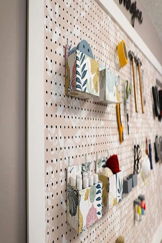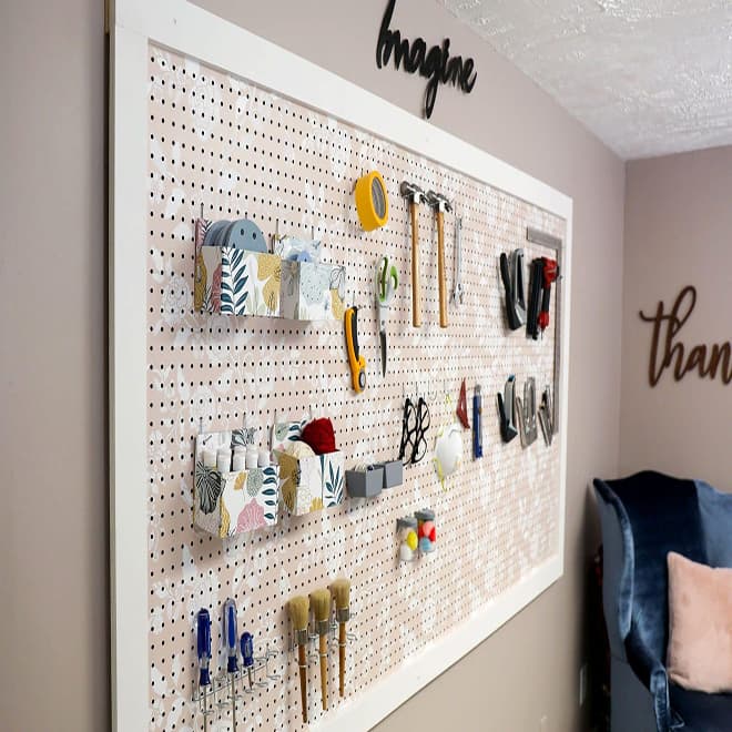 Once the framed pegboard is securely in place, it’s time to decorate! Additional pegboard hooks can be purchased from home improvement stores or online. This is the perfect time to put your own special touch on the project.