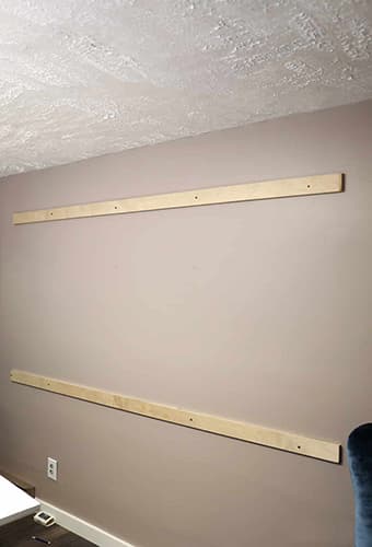 Once you’ve found the studs, use a power drill and 2 ½” screws (with a level to make sure the boards are parallel) to secure the boards (top and bottom, evenly spaced 4′ apart) to the wall. You may want to hang a few vertical boards as well to help support the pegboard. Keep in mind that the vertical braces will reduce the number of holes available to hang things but will give your pegboard more stability in the middle.