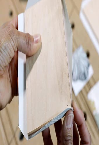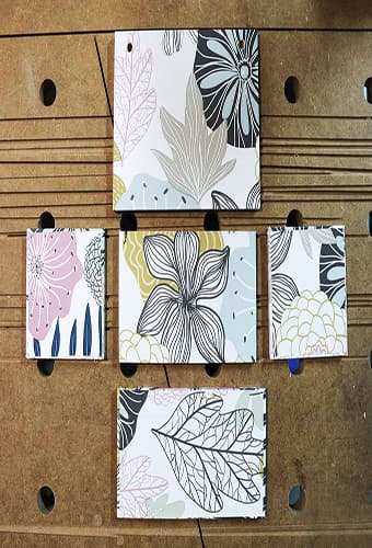 Back to the fun part – assembling and decorating the organizers! To garnish the organizers with wallpaper, lay out each of the five pieces onto the wallpaper and cut around each piece, leaving about 1″ around the perimeter. To attach the piece of wooden organizer, peel off the backing of the wallpaper and press the wooden piece into the center of the sticky side to attach it. Trim each wallpaper corner by clipping it with scissors.