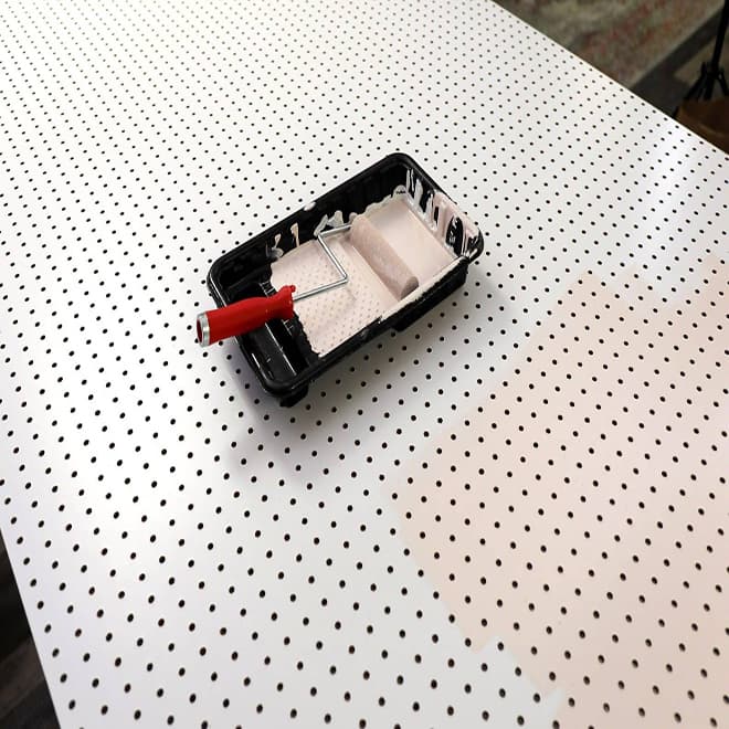 Start by painting your pegboard a solid color all over. Use a small foam roller to apply two coats, letting the coats dry in between.