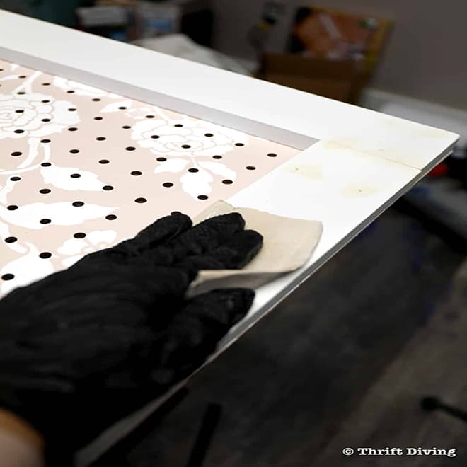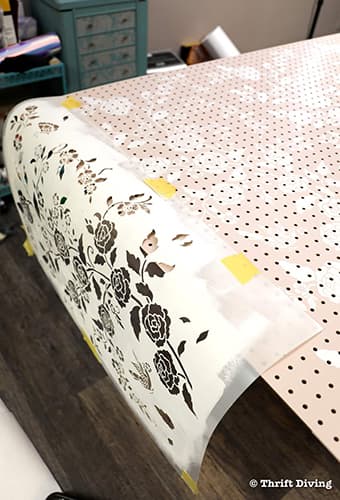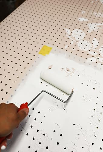 Next, gently roll the foam roller over the stencil, ensuring that it doesn’t shift. Once the section is done, carefully lift the stencil. Then, use the repeat reference marks on the stencil to align it over the next section and tape it in place before using the foam roller again. Repeat until the entire surface of the pegboard is stenciled. The pattern should come out nice and crisp.