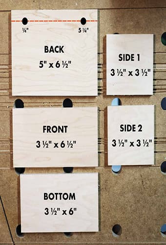 Place a sacrificial board underneath the wood. This helps prevent tear-out when drilling holes so that you’ll have a clean hole in the front and back of the wood. Use a brad point drill bit, which also helps create clean holes. The holes should be placed at ¼” and 5 ¼” along the top and approximately ¼” down from the top. Keep these consistent so that your organizers line up nicely on your framed pegboard.