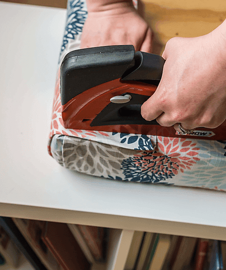 Starting in the middle of one straight edge, gently pull the fabric up and around to the back of the cushion and staple it to the plywood using your T50R.E.D. staple gun. Your staples should be 1″–2″ from the edge of the plywood – don’t worry if that leaves a bunch of loose fabric behind the staple, you can trim that off after you’re done stapling. Be sure to pull the fabric straight back (perpendicular to the edge of the plywood) so that you don’t end up with weird pulls or pleats in your fabric as you go.