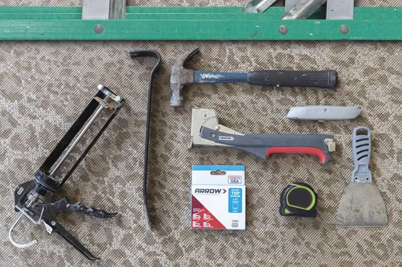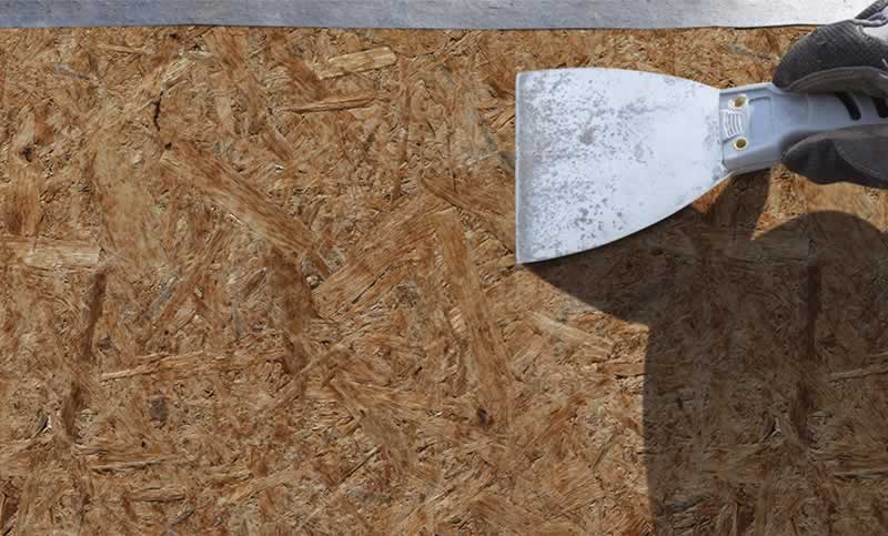 Remove all nails, staples, dirt and debris that are attached to the wood sheathing. If the wood is damaged or rotted, it will need to be replaced. Consult a licensed contractor for this repair. Our sheathing was not damaged. ARROW TIP: Run a putty knife over all exposed areas of the wood to clean debris and to check for any missed nails or staples.