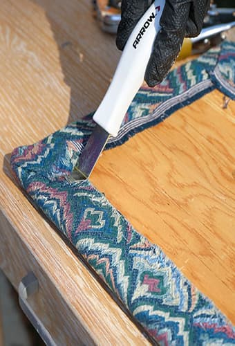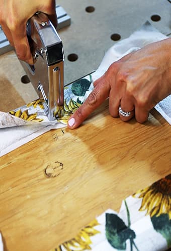 It’s time to begin reupholstering! Start by cutting your batting to a little larger than the size of your seat. Then, secure the batting into place using your Arrow T50 staple gun. To get tight corners, pull and fold, then staple. Check the top of the stool seat as you go to make sure the fabric looks tight and clean. If necessary, trim some of the additional bulk from the batting.