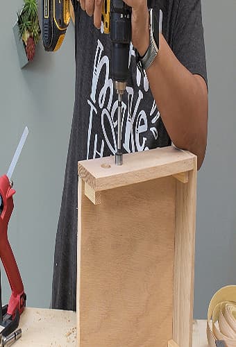Next, choose one of the long side pieces as your front. On this piece, use the Forstner bit to make three holes for your charging cords to pull through. You will want to make your first hole at least 2″ away from the edge, and then the next two holes ½” apart.
