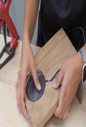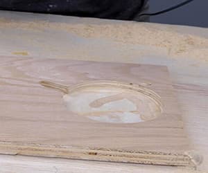 Next, make the inset for your wireless charger. Measure and mark its exact location on the bottom of the lid, then make a starter hole with the Forstner bit, being careful not to go all the way through the plywood.