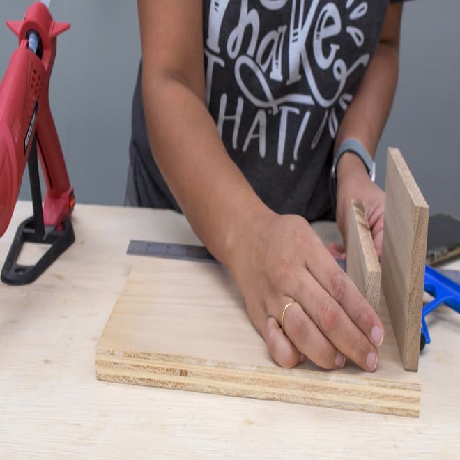 Next, it’s time to add lid supports. Using your Arrow GT300 glue gun, attach the square dowels to each of the four corners of the lid. These will help hold the lid up when the box is closed.